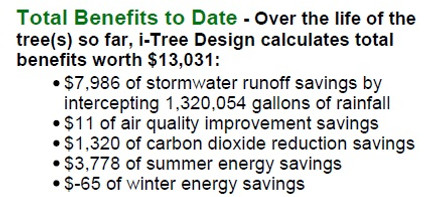 This report tells us that the existing trees provide $2,770 of stormwater runoff savings by intercepting 457,929 gallons of rainfall, $4 of air quality improvement, $321 of savings through decreased energy production and sequestration of carbon dioxide, $819 of summer energy savings, and $221 of winter energy savings over the next five years. The report also shows that the most beneficial trees in terms of savings is the large oak tree on the east side of the front of the home, with $151.75 in savings for the current year. This same oak tree has also provided about $2700 in savings throughout its entire lifespan.